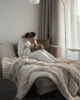Pradžioje pledas gali šiek tiek pūkuotis – tai visiškai normalu. Rekomenduojame jį kartkartėmis pakratyti iš visų pusių (geriausia lauke), kad natūraliai pasišalintų iškritę pūkeliai.