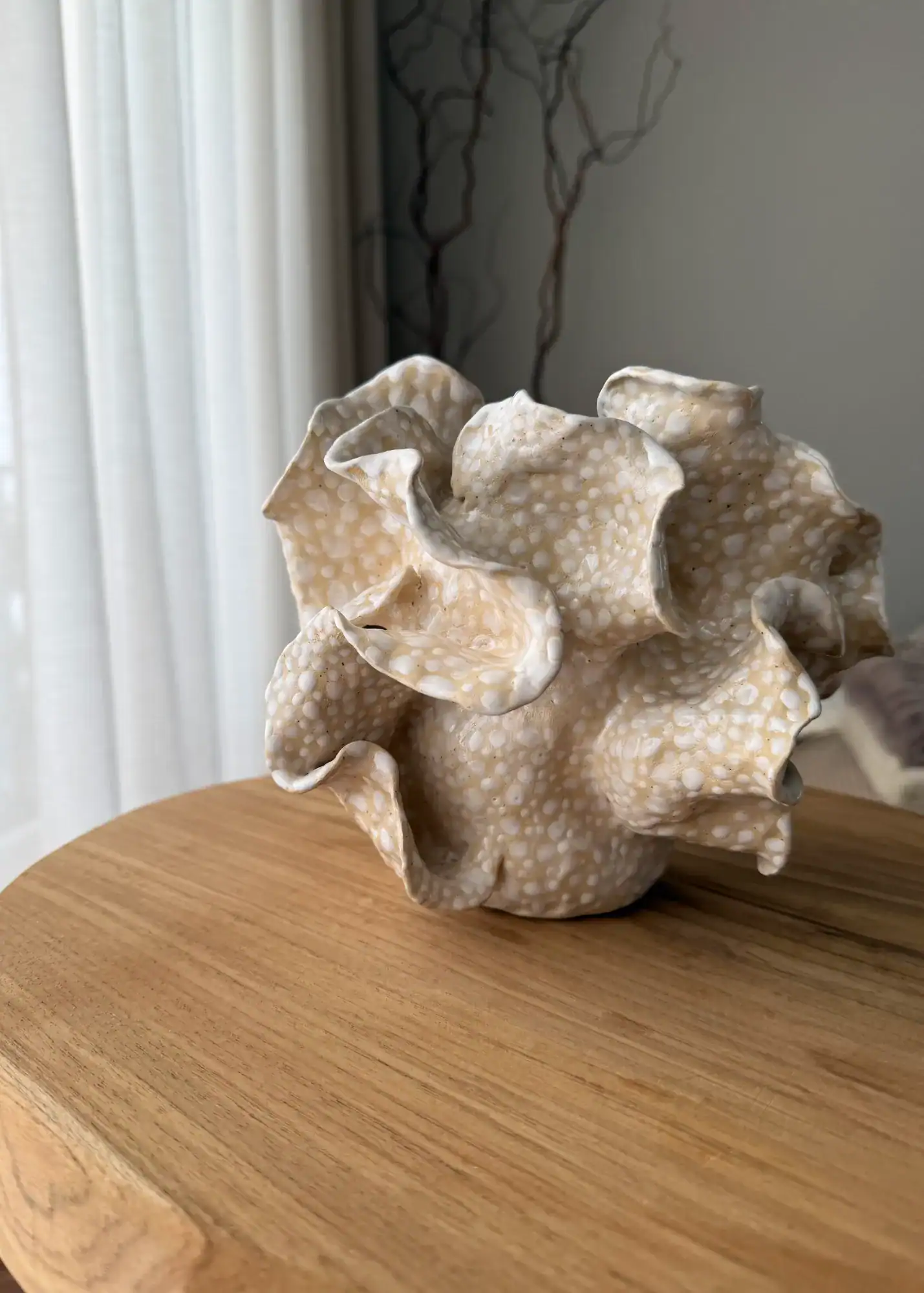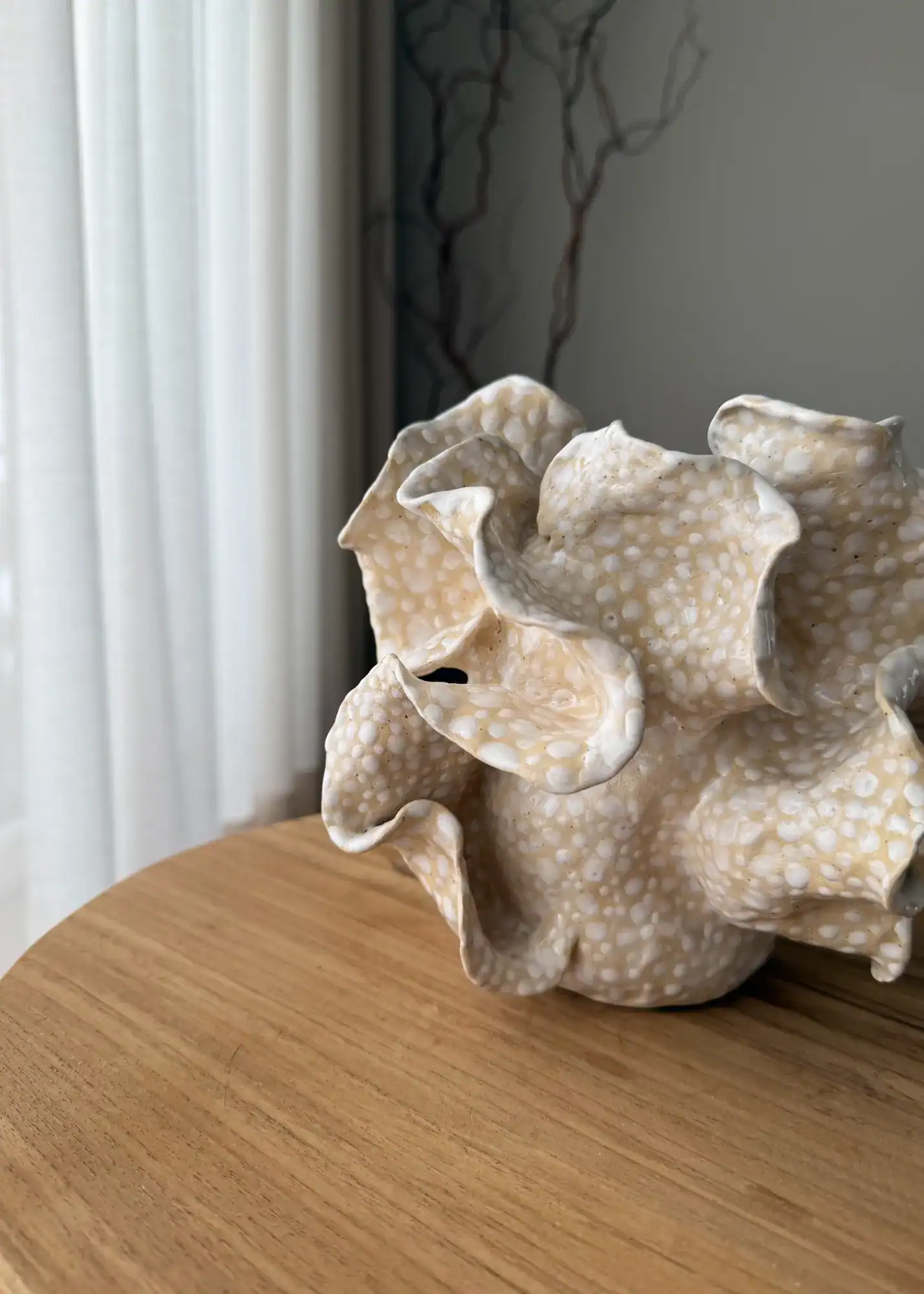 Banguotos, organiškos linijos kuria lengvumo ir judesio pojūtį, o subtili paviršiaus tekstūra suteikia vizualinio gylio. Dėl to ši dekoratyvinė vaza tampa ne tik interjero detale, bet ir savarankišku estetiniu akcentu.