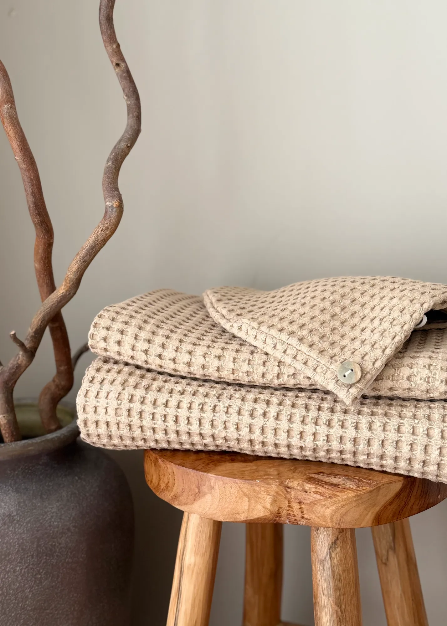 Po pirmojo skalbimo audinys šiek tiek susitraukia (±2 cm), o vaflinė struktūra tampa dar ryškesnė. Turbanas tampa minkštesnis ir dar malonesnis naudoti.