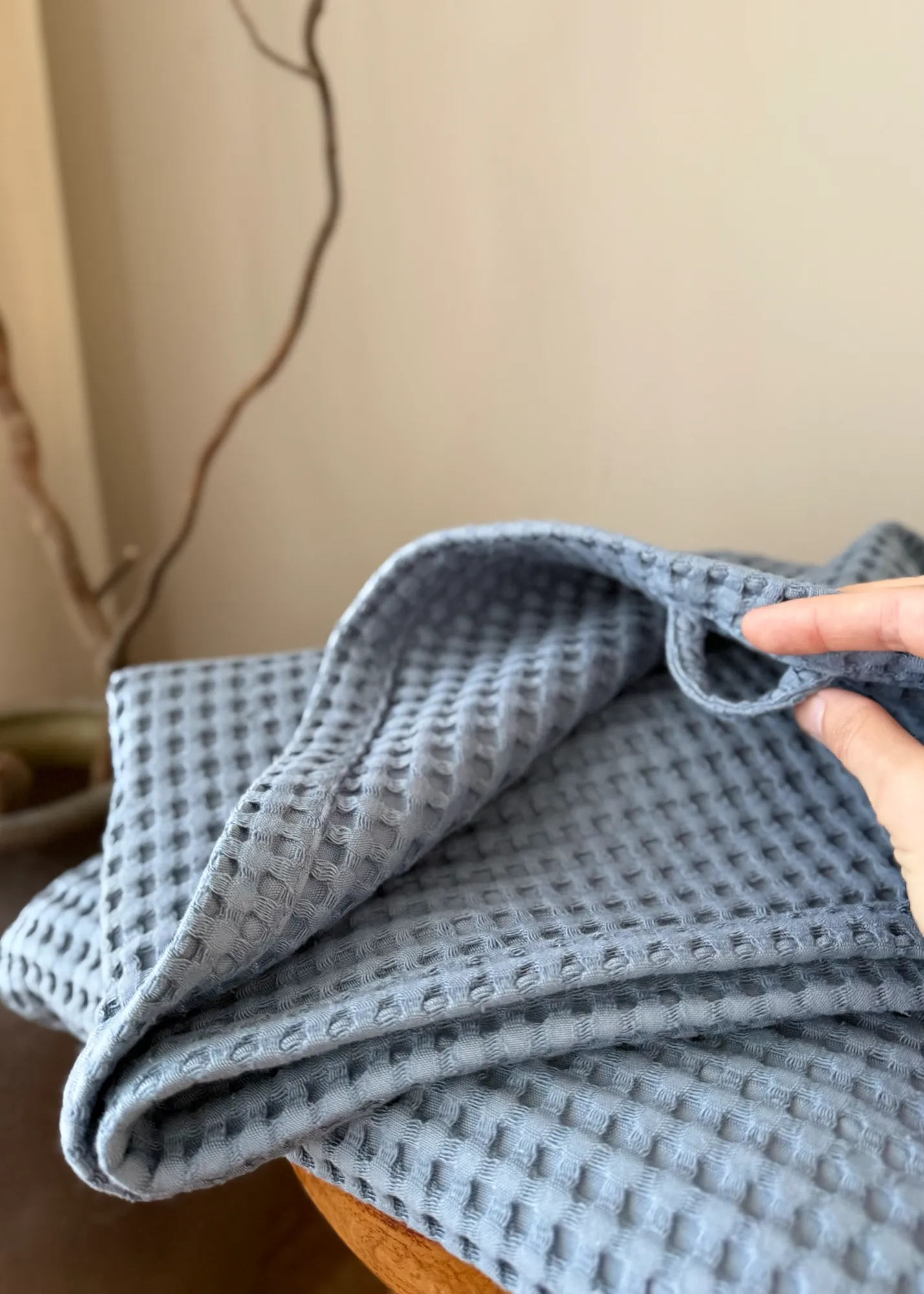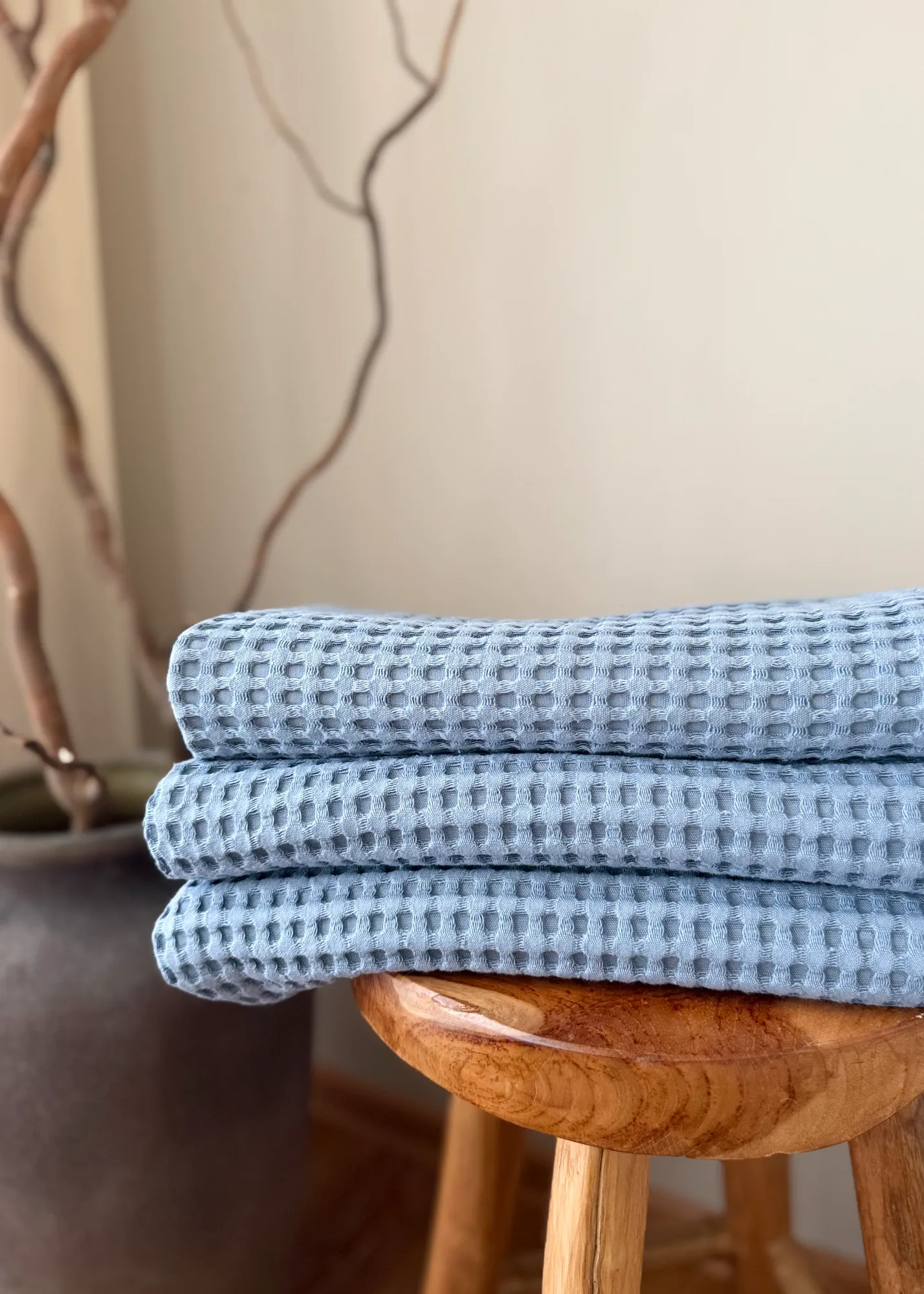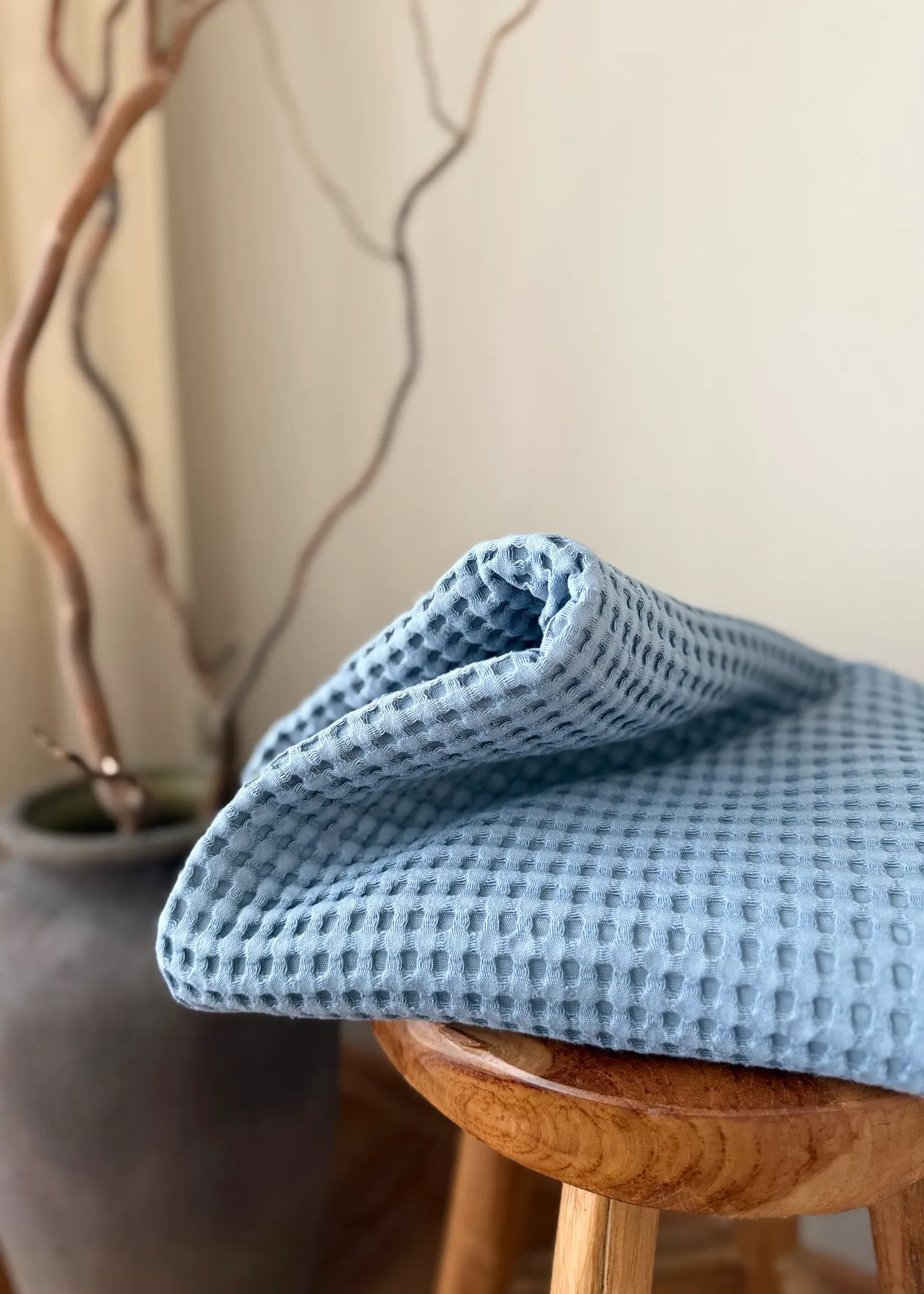 Po pirmojo skalbimo audinys natūraliai šiek tiek susitraukia (apie ±2 cm). Tai normalu vafliniam audiniui – tuo pačiu jis tampa minkštesnis ir dar malonesnis naudoti.